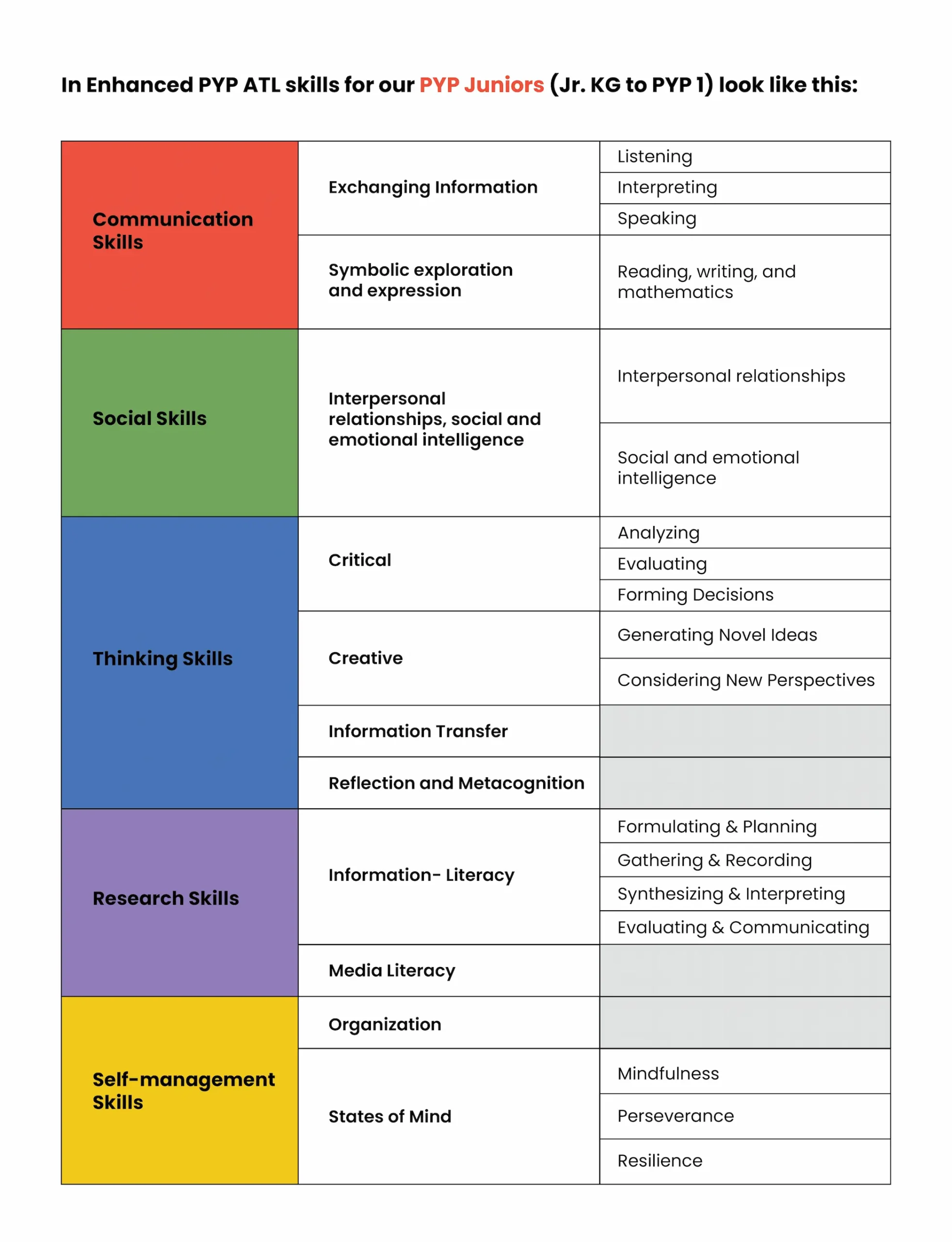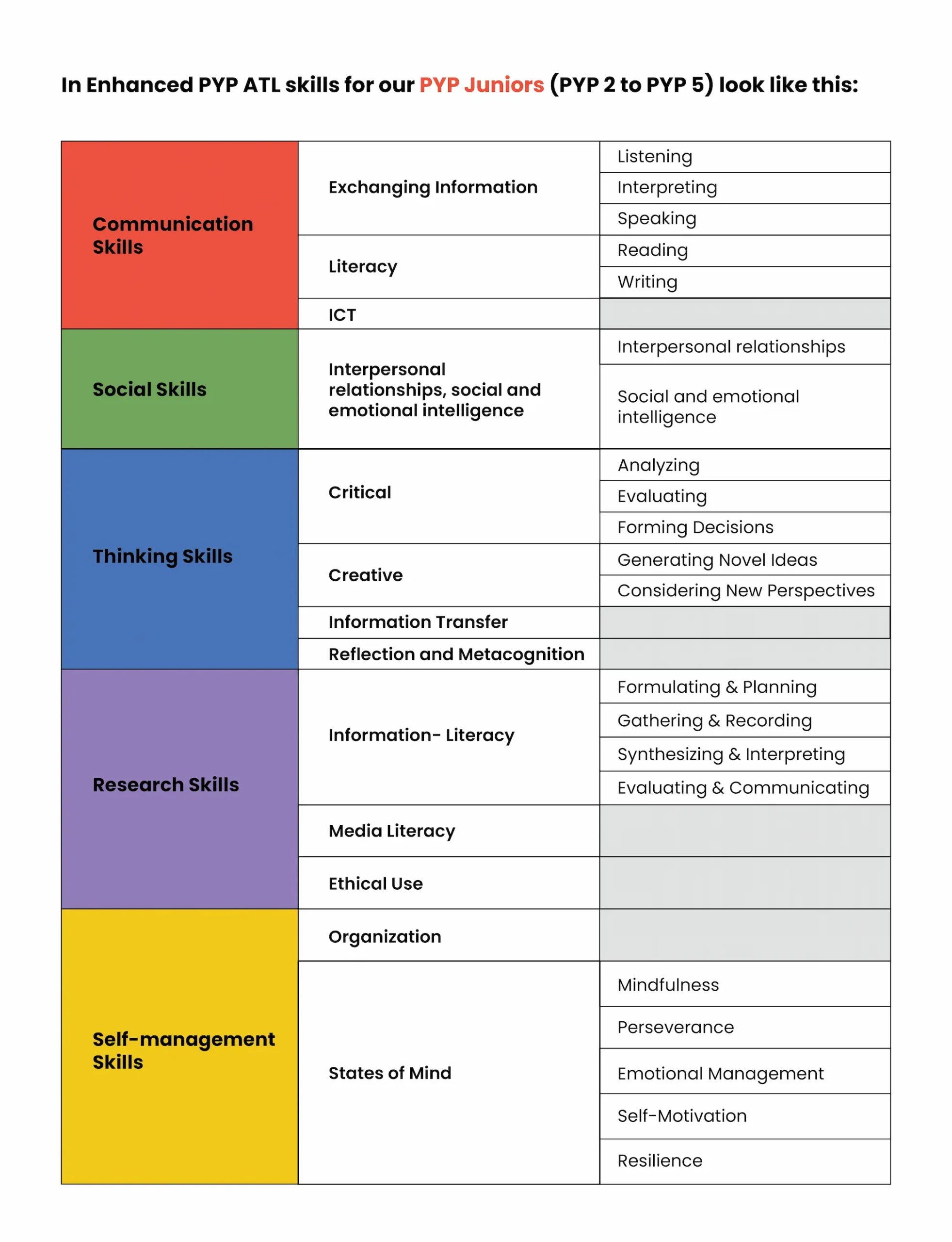 Skills had been catered to by IB for a long time. Formerly known by the International Baccalaureate Organisation as Transdisciplinary Skills, these are, simply put, a set of skills that we use when we are involved in learning.